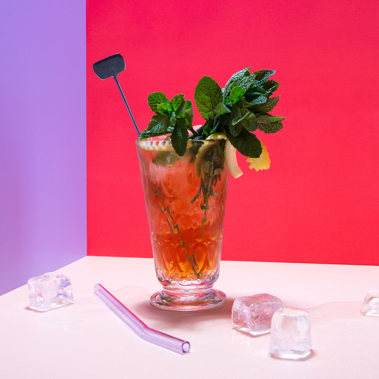 Longdrinkglas / Eiswürfel / Minze / Zitronenspalte