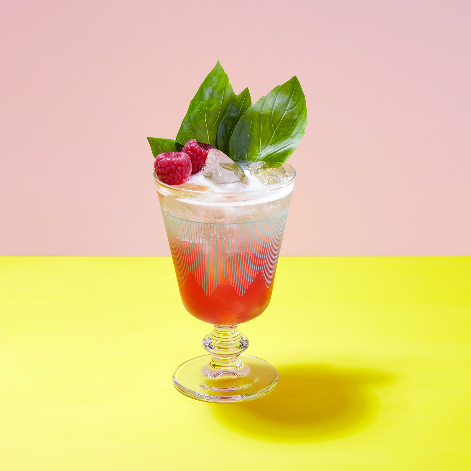 Weinglas / Eiswürfel / 2 Blatt Basilikum / Himbeeren