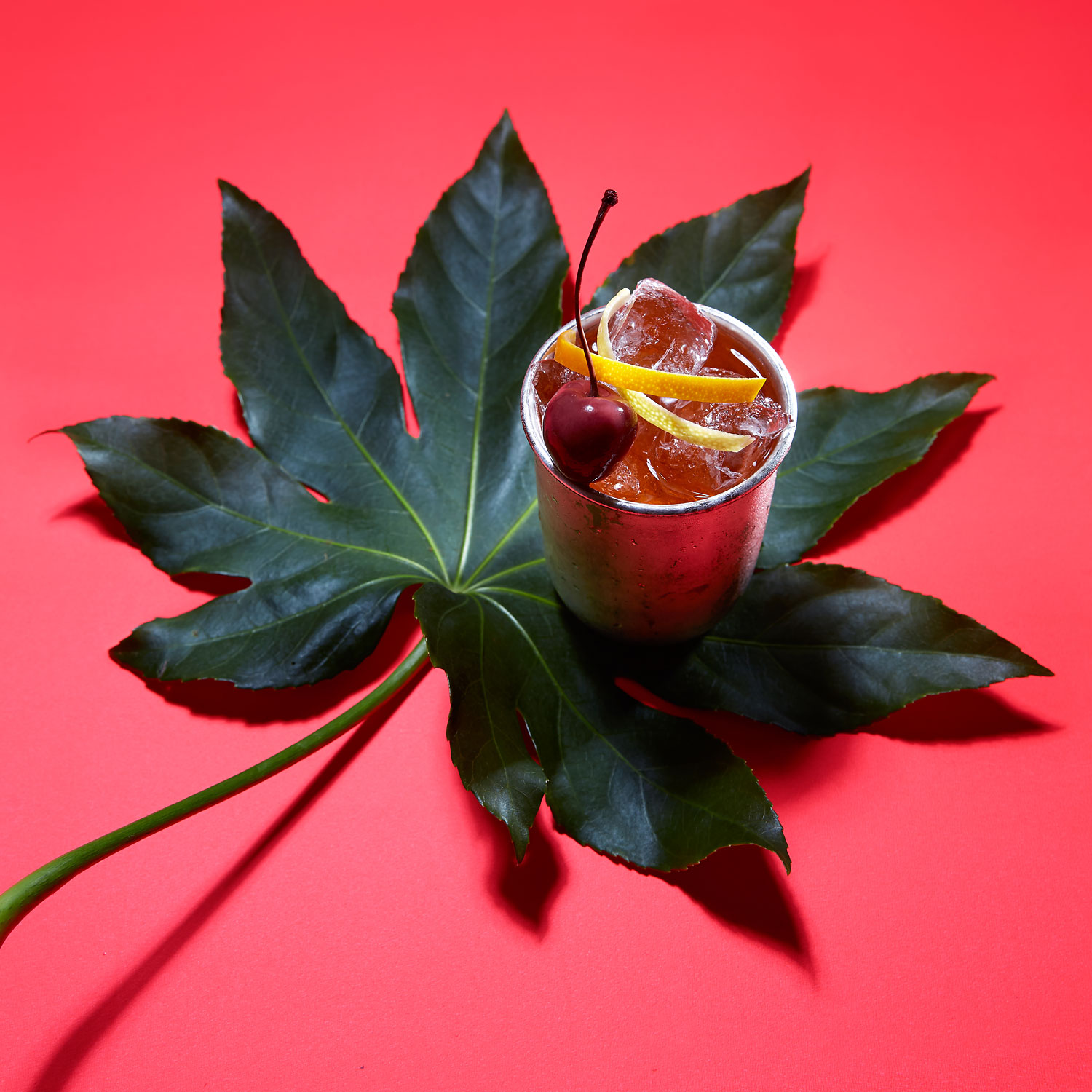 Silberbecher / Eiswürfel / Zitronenzeste / Orangenzeste / Cocktailkirsche