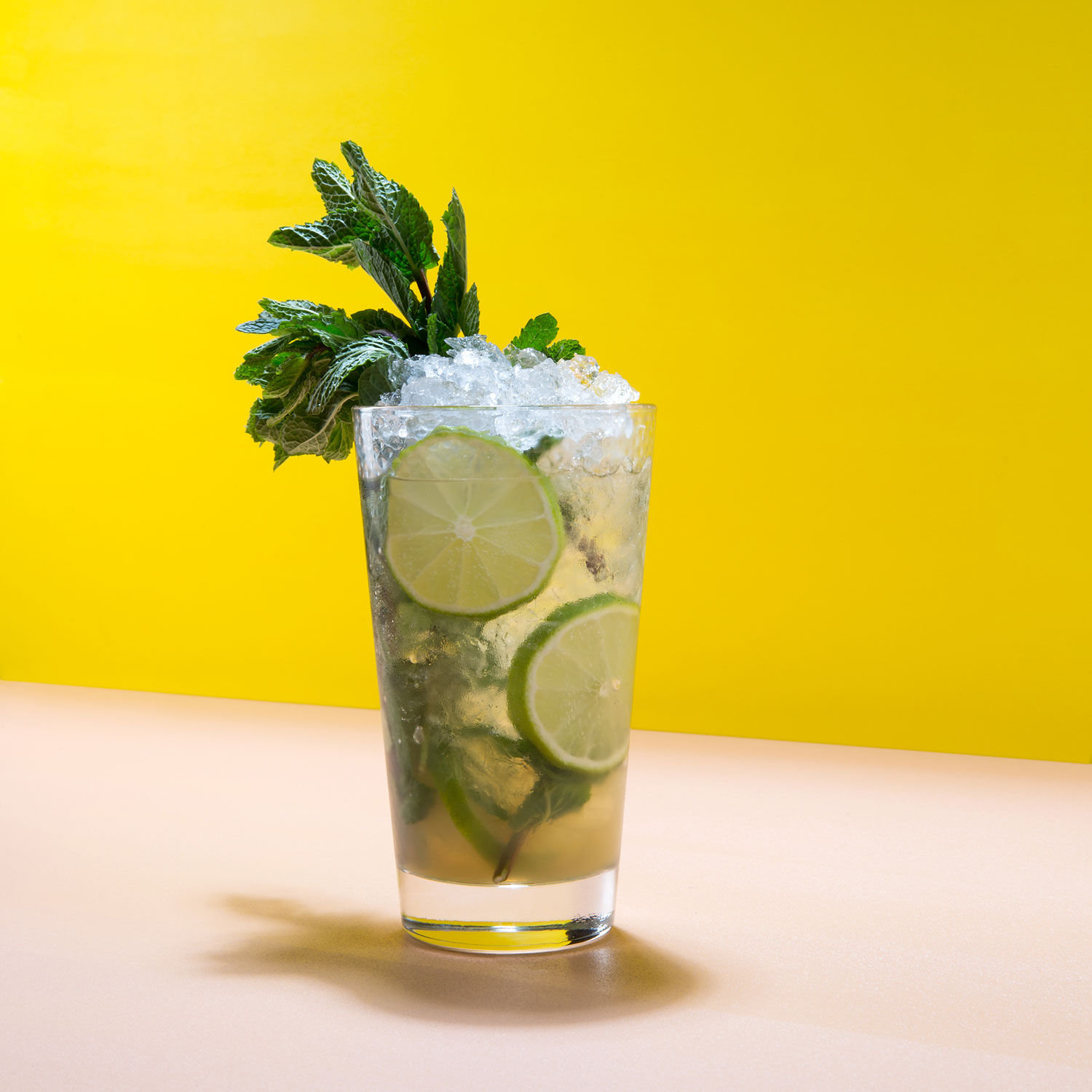 Longdrinkglas / Eiswürfel / Minze / Limettenscheiben